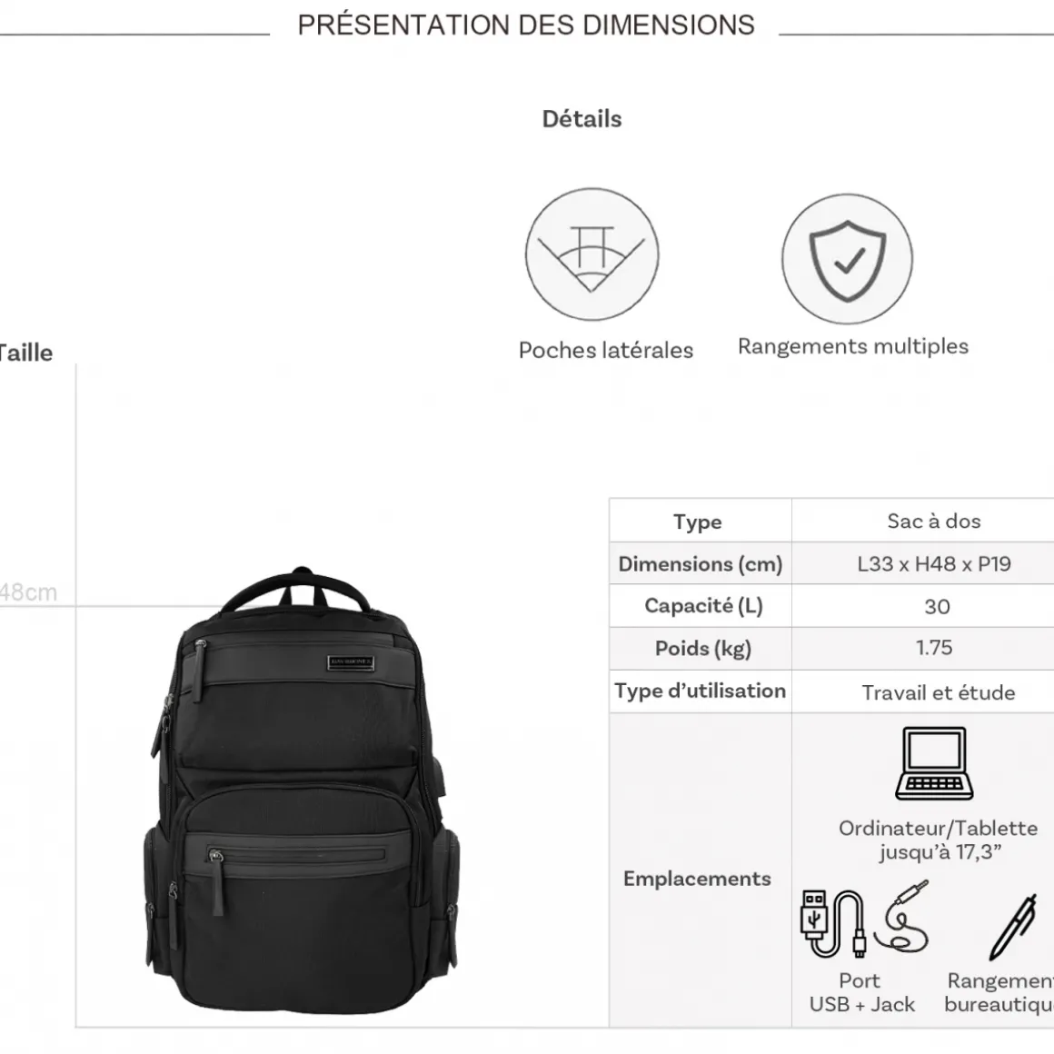 | Dimensions (cm) : L 33.00 x H 48.00 x P 19.00 |