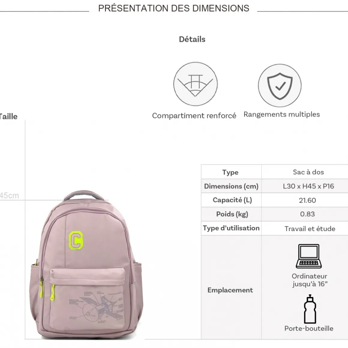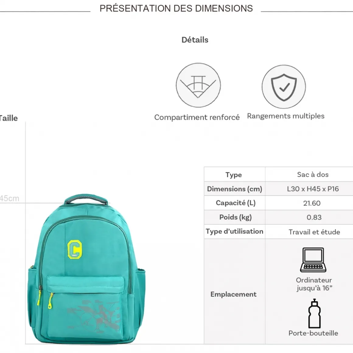 | Dimensions (cm) : L 30.00 x H 45.00 x P 16.00 |